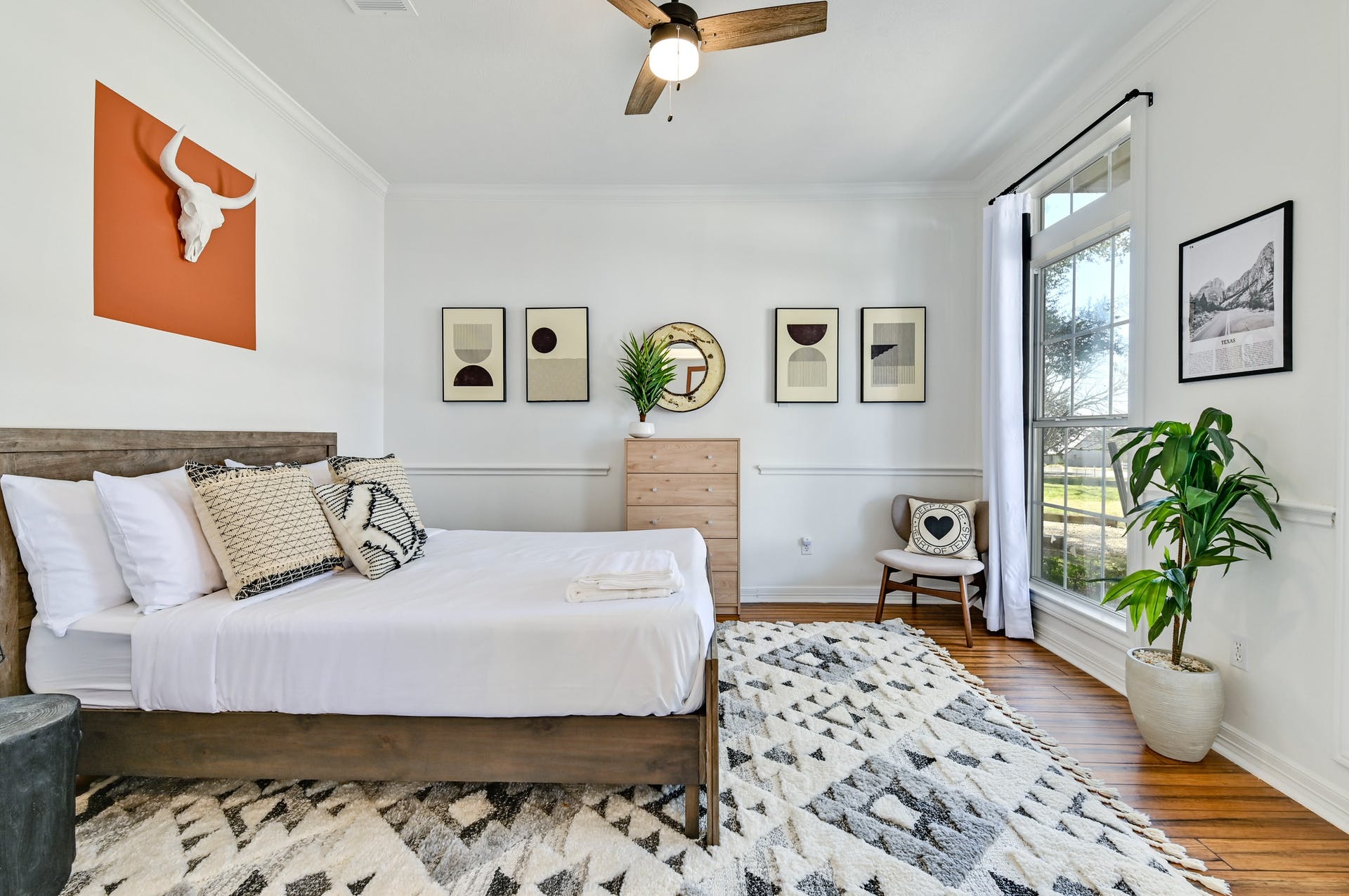 Yesterday I walked into a client's property with a long-term renter renting the property. A well-known spiritual podcaster rents the house now and has Buddhas, crystals, and spiritual objects everywhere. Although the home is very modern, the all-white backdrop against the wood, crystals, sheepskin rugs with Moroccan tapestries offers contrasting but complementary elements. He had a wall decal in one room and told my client he could take it down when he moved out in a couple of weeks.