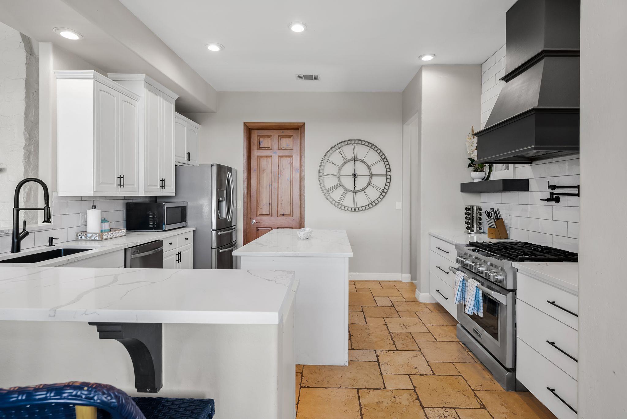 Inside, all kitchens and baths have been beautifully updated with quartz and marble countertops. The light-filled main kitchen opens seamlessly to the living and dining areas, creating an inviting space for gathering and entertaining. The spacious primary suite on the main level features a clawfoot soaking tub, frameless glass shower, and morning light, with an additional room nearby perfect for a home office or nursery.